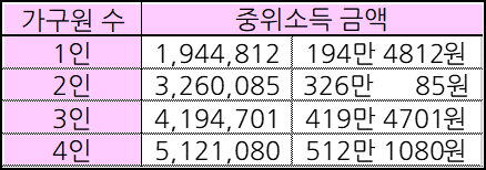 그렇다면 내가 신청할 수 있는지 자격요건을 확인하는 것도 중요하겠습니다. 반려동물의료비지원도 중위소득을 기준으로 지원여부가 결정되게 됩니다. 아래는 2022년 기준 중위 소득표이니 더 자세한 사항은 확인이 필요하겠습니다.