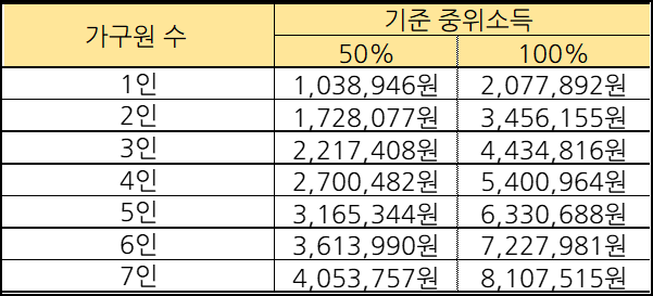 아래는 2023년 기준중위소득 표이니 참고하시기 바랍니다.